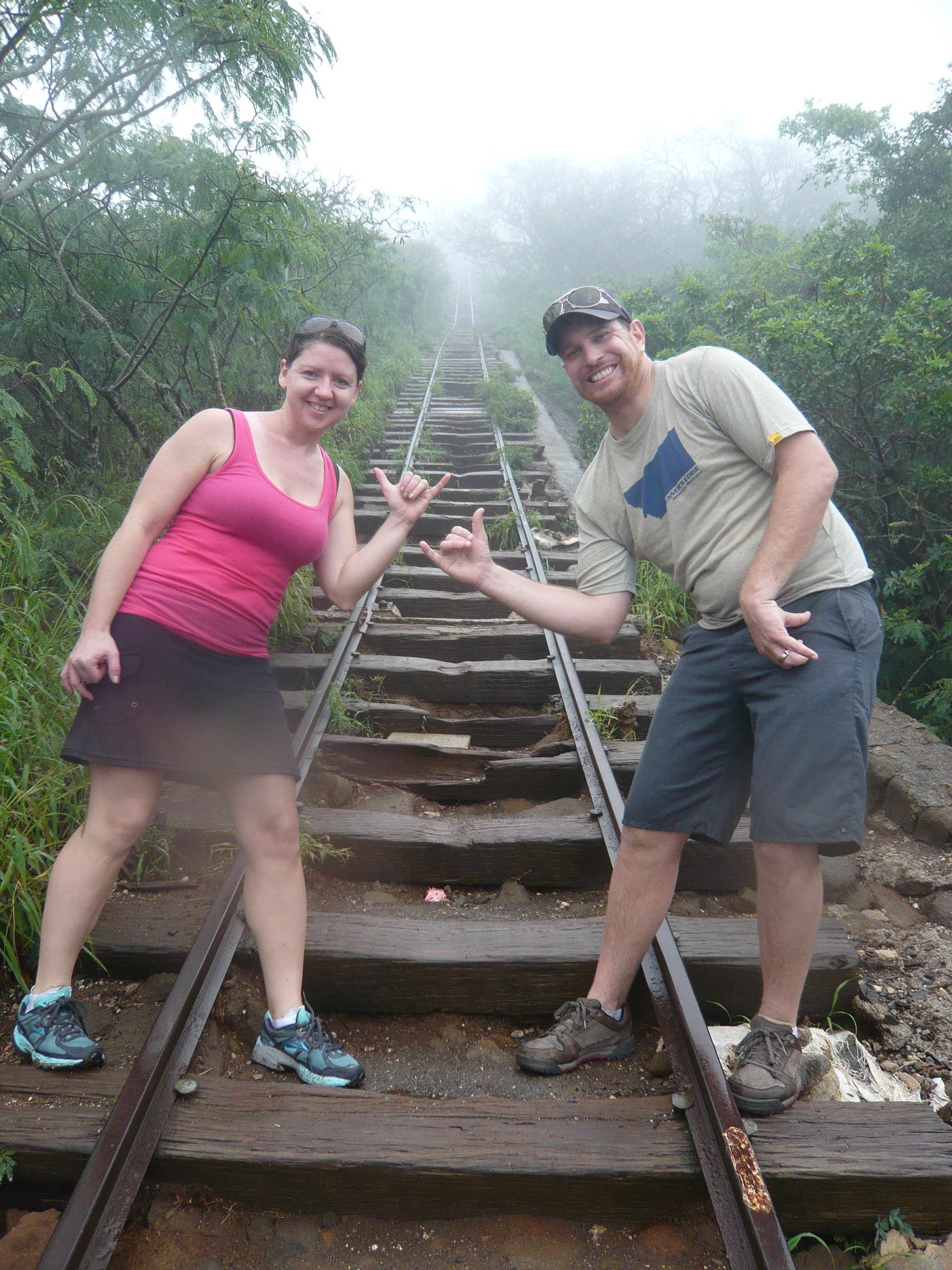 Hard but not overly long. I have never hiked a trail that was as straight UP! Wow were our legs burning! We literally climbed railroad ties all the way up and 3/4th of the way there heavy rains soaked us to the bone and robbed us of any view other than cloud, but it did allow us to meet some nice people. We found an abandon tunnel and all took cover in it for about 30 minutes. It is amazing the galvanizing power of a big hike and lots of rain. All the people were really nice and the time flew by as we swapped traveling and hiking stories. Once the rain let up a bit we made our way slowly down the muddy, slick and STEEP path. Once we were at the car we had a choice to go home and dry out or go the the Kona Brewing Company. We did what any good Coloradan would do… we had a couple beers! Cheers!